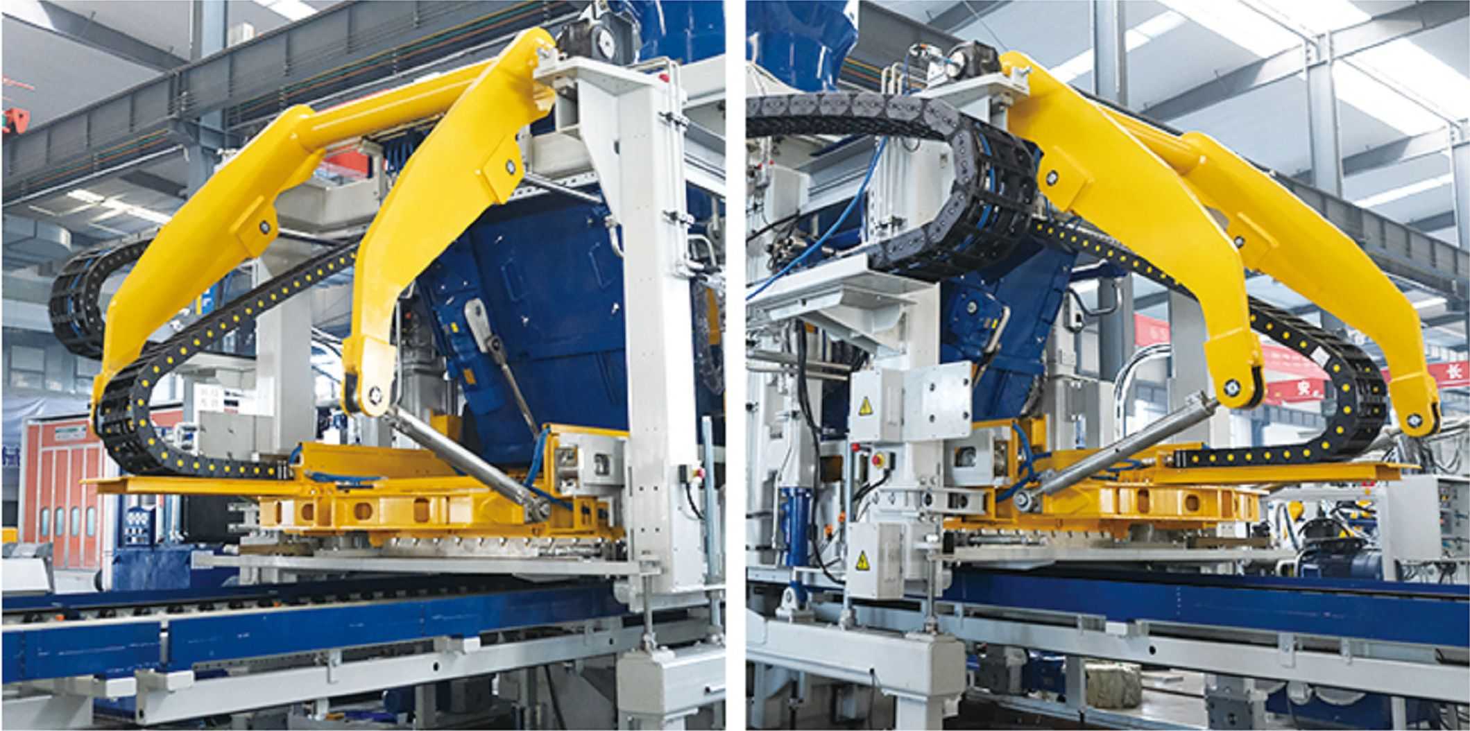उच्च दर्जाचे फ्रेम डिझाइन: मुख्य फ्रेम पेटंट तंत्रज्ञानासह डिझाइन केलेली उच्च-शक्ती वेल्डेड फ्रेम संरचना स्वीकारते, जी विशेष स्टीलद्वारे वेल्डेड केली जाते. फ्रेमची उच्च गुणवत्ता आणि उच्च स्थिरता सुनिश्चित करण्यासाठी संपूर्ण फ्रेम वृद्धत्वाच्या कंपन उपचारांच्या अधीन आहे. हे उच्च अचूकतेसह समर्थन आणि मार्गदर्शक म्हणून मोठ्या-व्यास स्तंभांचा वापर करते. स्ट्रिपिंग यांत्रिक सिंक्रोनाइझेशन, अचूक डिमोल्डिंग आणि तयार उत्पादनांची उच्च सुसंगतता स्वीकारते.